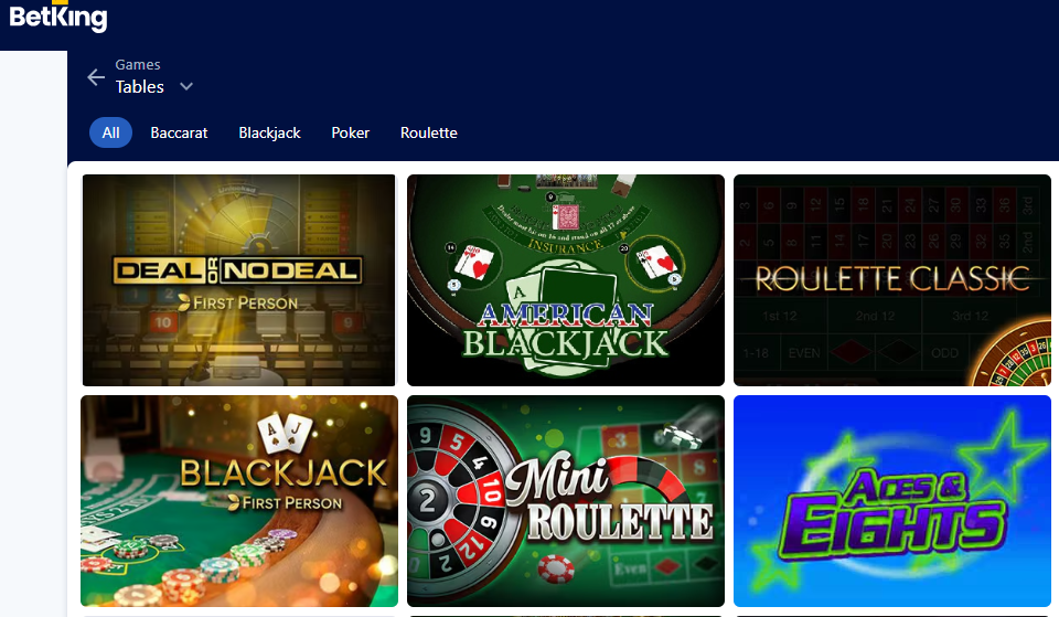 Most BetKing table games are skill-based because they require strategy to play. The games get their name in real life because they feature a large table that can seat several people. Titles that fall under this category include blackjack, roulette, and baccarat.Â